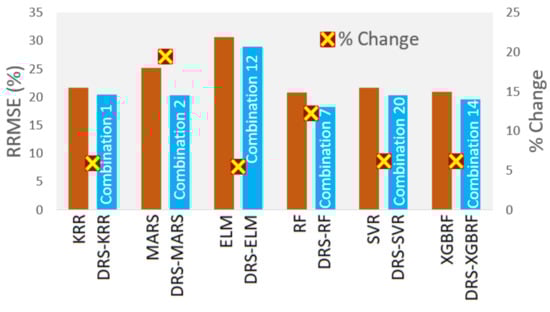 To better understand the predictive performance of the proposed hybrid DRS–RF model, the study employed the RRMSE (%) value for the standalone models (i.e., KRR, MARS, ELM, RF, SVR, and XGBRF) and their respective hybrid models, along with the percent change of RRMSE (%) while applied to the proposed hybrid approach (i.e., DRS–RF). Figure 6 shows that the newly constructed DRS–RF model had the lowest RRMSE (18%), significantly improving the performance of the standalone RF model (12%). The standalone ELM model had the highest RRMSE (%) value (30%), and the lowest value was found for the RF model (29%). After analyzing the different combinations with the proposed hybrid models and several benchmark models, the proposed hybrid model produced significantly superior results to standalone machine-learning modeling when it came to Y predicting.