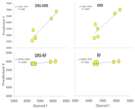 As shown in Figure 7, a scatterplot of the observed and predicted Y using the DRS–RF and standalone RF models indicated a precise prediction as an additional evaluation of the hybrid predictive model (i.e., DRS–RF). The scatter plots show that the coefficient of determination (R2) was related to the goodness-of-fit between the predicted and observed Y as well as a line of least-square fitting with the appropriate equation: Y = mx + c, where “m” is the gradient and “c” is the regression line’s y-intercept. As shown in Figure 7, the suggested model outperformed the baseline model by a wide margin, with an R2 value that was significantly higher using a hybrid machine-learning model (i.e., DRS–RF). The magnitudes reported from the hybrid DRS–RF model were the closest to unity when measured in pairs (m|R2), with values of 0.986|0.07 (m|R2) in comparison to the RF model (0.582|0.06). The unity for the other models (i.e., DRS–KRR, DRS–MARS, and DRS–SVR) provided a lower value of R2. The newly proposed hybrid RF predictive model outperformed the benchmark models using a carefully selected set of satellite-based predictor variables.
