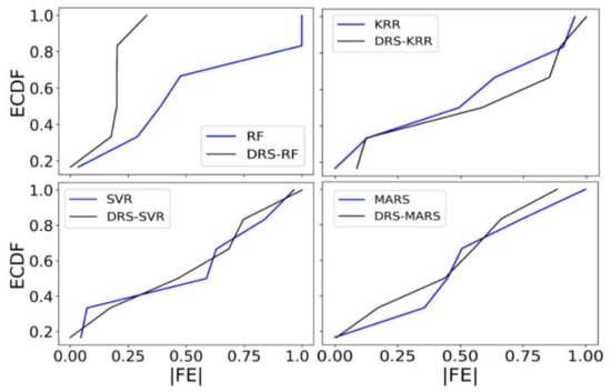 Empirical Cumulative Distribution Function (CDF) of prediction error |FE| of Y generated by the proposed DRS–RF vs. benchmark models.