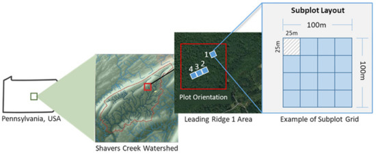 The study area is located in central Pennsylvania, United States, and is comprised of four one-hectare (100 m × 100 m) forest plots. The plots are situated in the Leading Ridge 1 subsection of the Shavers Creek Watershed. Each plot was divided into sixteen 25 m × 25 m subplots, for a total of 64 subplots, with the corner and center points of each marked with durable stakes to enable accurate georeferencing and to support ongoing research efforts. Plot 1 was used to develop and refine or train the method, and plots 2−4 were used as test plots to evaluate the method’s performance. Figure 1 illustrates the relative location of the study area and plots, as well as the subplot configuration.
