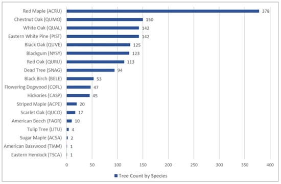 Aggregate tree count by species for the four one-hectare study plots. ACRU—Acer rubrum, QUMO—Quercus montana, QUAL—Q. alba, PIST—Pinus strobus, QUVE—Q. velutina, NYSY—Nyssa sylvatica, QURU—Q. rubra, SNAG—dead tree, BELE—Betula lenta, COFL—Cornus florida, CASP—Carya species, ACPE—A. pensylvanicum, QUCO, Q. coccinea, FAGR—Fagus grandifolia, LITU—Liriodendron tulipifera, ACSA—A. saccharum, TIAM—Tilia americana, TSCA—Tsuga canadensis.