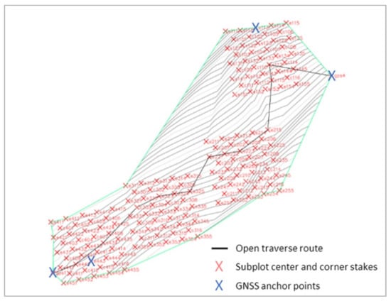 Open traverse through study plots utilizing GNSS anchor points.