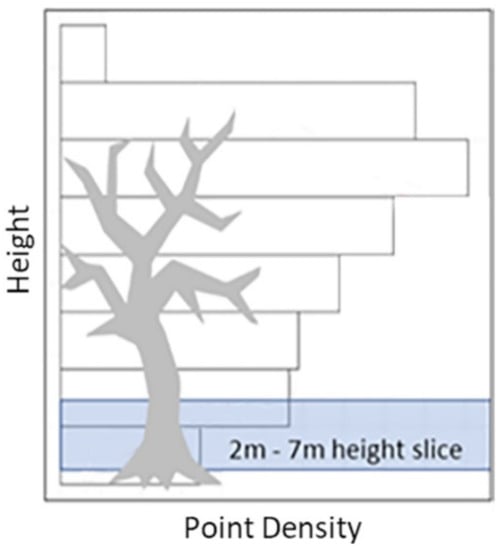 The LiDAR point clouds associated with each one-hectare plot contain over a million points. To efficiently process these clouds and focus on stem detection, we selected a specific vertical range to eliminate points representing the canopy and the dense ground cover often found in northeastern U.S. forests. A histogram of point density (Figure 7) was generated and used (similar to [,]), along with field observations, to determine an optimal range of 2 m to 7 m above ground level. This range allows us to efficiently segment and detect tree stems as it excludes low-lying foliage and the major branches of most trees in the plots, providing a clearer perspective of the vertical trunk structures. Segmenting the point cloud in this way also drastically reduced the number of points to be analyzed, resulting in increased efficiency and processing speed, which supports our goal of scalability.