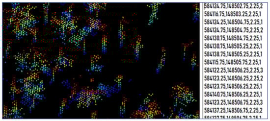 Data from the voxelized, height-sliced, and intensity-filtered point cloud were converted to text format using LAStools LAS2Text [] for input to the prediction algorithm. The data output included a 2D coordinate (X,Y), the corresponding vertical height increment, and the count of points for each voxel enabling creation of a voxel column (Figure 8). These data were used to identify candidate voxel columns that might represent a tree.