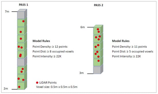 Visual summary of logic and rules for the two-pass voxel-based approach of identifying predicted tree locations from voxel columns.
