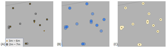 Summary of duplicate point merging steps in ArcGIS Pro. (A) The predicted tree locations generated by the two-pass approach, (B) 0.5 m buffers around all prediction points and (C) overlapping buffers converted to merged polygons and new predicted tree locations.