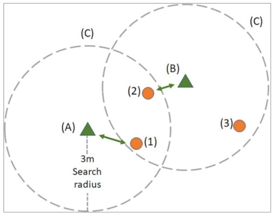 The model (Equations (1)–(5)) maximizes the number of feasible matches while minimizing the total distance between pairs of matched trees and satisfying the constraints that (1) a predicted tree can be matched to at most one reference tree, (2) a reference tree can be matched to at most one predicted tree, and (3) the number of matches must be greater than or equal to some minimum. The minimum of (1) the number of reference trees, and (2) the number of predicted trees is an upper bound on the maximum number of feasible matches, but the actual number of feasible matches can be less than this upper bound if, for example, two predicted trees can only be matched to a single reference tree. The parameter i is initially set to zero and incremented by one until a feasible solution is achieved. The output of this model is a set of matched pairs of predicted and measured trees. As noted, a 3-m search radius was used to generate the near-matches of predicted trees for each reference tree (Figure 11).