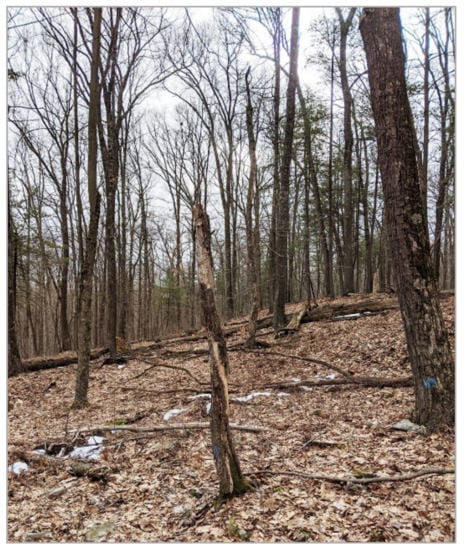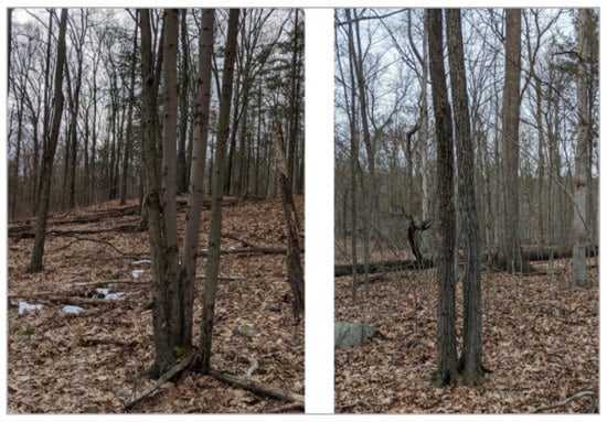 Much of the research in ITD has focused on conifer-dominated forests and homogenous stands, such as plantations [,,]. A recent review of 207 individual tree detection studies [] found that only 6.3% were performed in closed hardwood forest types. Tree detection rates above 65% in coniferous or conifer-dominated forest types are common throughout the literature, whereas performance in deciduous or mixed-species forests typically is notably lower [,,,]. Numerous characteristics of hardwood forests explain this disparity in performance and, perhaps, also the lack of focus in prior research. For example, hardwood forests, like those found in the northeastern United States, are composed of a range of species, numerous variations of multi-stemmed, forked, leaning and arced trees, and dead trees or snags that are often broken off and short. In contrast to many conifer-dominated forests, the canopy structure of hardwood forests is more complex, and the species, age, size and height of trees can be quite varied. The height variation results in suppressed and intermediate trees that are particularly difficult to identify with top-down ITD methods that use the top canopy for crown segmentation []. Furthermore, the forking and branching patterns of hardwood trees often result in multiple apparent canopy segments that belong to a single tree. Given the poor performance of existing ITD methods in deciduous forests, many of which are top-down approaches that rely on canopy height models (CHMs) to infer details and locations of the underlying trees [,,], there exists an opportunity to develop an alternative ITD method that is designed specifically for, and performs well in, hardwood-dominated forests.