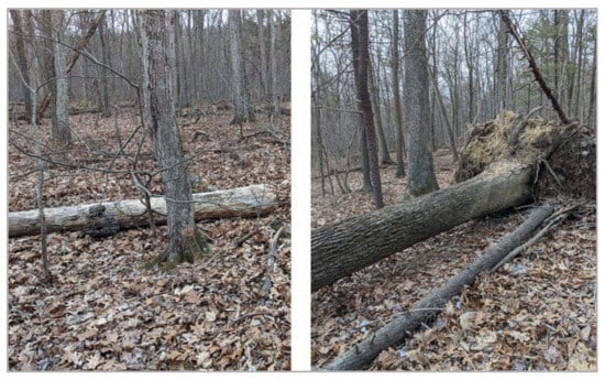 Examples of downed trees discovered through follow-up field visits, which were vital to gaining context and analyzing false negatives and false positives.