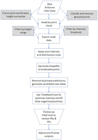 Figure 14 summarizes the steps in the individual tree identification procedure from the initial raw LiDAR data set to the field verification step.