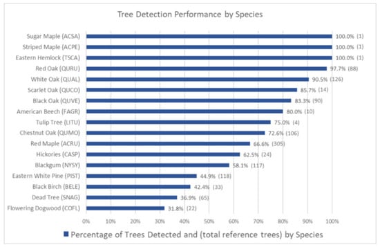 Tree detection performance by species with (tree count). ACSA—Acer saccharum, ACPE—A. pensylvanicum, TSCA—Tsuga canadensis, QURU—Quercus rubra, QUAL—Q. alba, QUCO, Q. coccinea, QUVE—Q. velutina, FAGR—Fagus grandifolia, LITU—Liriodendron tulipifera, QUMO—Q. montana, ACRU—A. rubrum, CASP—Carya species, NYSY—Nyssa sylvatica, PIST—Pinus strobus, BELE—Betula lenta, SNAG—dead tree, COFL—Cornus florida.