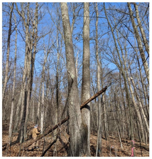 Tree locations were linked to a global coordinate system by placing multi-band GNSS receivers (Emlid, Saint Petersburg City, Russian Federation) at relatively open locations on opposite ends of the grid and gathering satellite signals for several hours to establish high-precision GPS anchor points (Figure 6). An Emlid GPS unit was also placed on a permanent USGS control point approximately 1.6 km from the study area to enable differential correction of the anchor points. An open traverse was performed with the TopCon Total Station to link the anchor points to the grid of center and corner stake locations. This procedure resulted in a mean horizontal accuracy of 11.3 cm for plot corners and centers. To support the ArcGIS Pro [] portions of the workflow, easting and northing coordinates for each tree were used to create a shapefile for each study plot using the lidR plugin [] for R software [].