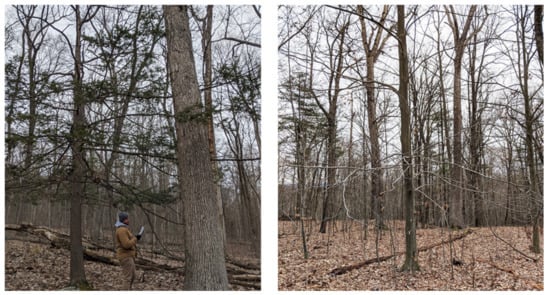 The choice of a voxel-based approach emerged from initial experiments using established canopy height-based and point-based methods [,] with data from the study area and extensive manual visual analysis of LiDAR point clouds. While in some cases tree crowns can be identified in the point clouds, it is often difficult to do so in the mixed-species hardwood forests in our study area. Because the canopy contours are very subtle, canopy height model-based approaches, such as watershed methods, do not reliably determine where one crown ends, and another begins. In addition, what appear to be multiple crown segments are frequently all part of the same tree due to the tree having several large branches. Moreover, the crowns of hardwood trees often are not centered over the tree trunk location due to forking, leaning, and other structural attributes. As a result, even if the crown of an individual tree is successfully segmented, it does not necessarily provide an accurate tree location, making it difficult to link crown segments to ground-based tree records.