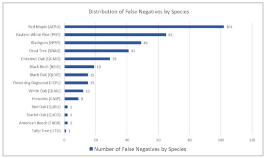 Summary of false negatives by species. ACRU—Acer rubrum, PIST—Pinus strobus, NYSY—Nyssa sylvatica, SNAG—dead tree, QUMO—Quercus montana, BELE—Betula lenta, QUVE—Q. velutina, COFL—Cornus florida, QUAL—Q. alba, CASP—Carya species, QURU—Q. rubra, QUCO—Q. coccinea, FAGR—Fagus grandifolia, LITU—Liriodendron tulipifera.