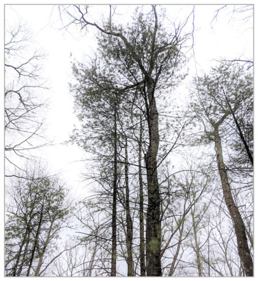 For FNs, or missed trees, the field follow-up visits again were quite valuable. While each FN was not reviewed, a significant number of particularly large DBH trees and trees noted as snags, which might be difficult to detect, were reviewed. This effort identified several downed trees and short snags (Figure 21) that were outside of the detectable range based on the algorithm rules. Several patterns among FNs were observed, including leaning or curved boles, suggesting that these trees were not detected due to their tendency to span several voxel columns in the detection height ranges used. Voxel sizes larger than 0.5 m were tested in the development phase, but resulted in overall poorer results, so a different approach must be taken to address leaning trees. The algorithm detected less than half of the eastern white pines in the study area, likely due to the low, diffuse branching structure of this species, which tends to disperse the LiDAR returns. In addition, proximity to eastern white pine trees also contributed to FNs, likely due to the dispersal of the LiDAR returns by the pines’ branches (Figure 22). This could be considered a “neighborhood effect” [] and warrants further exploration.