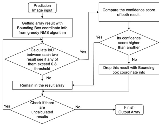 The greedy non-maximum suppression (NMS) algorithm is commonly used in object detection to solve the problem of overlapping prediction results, which was proposed by Girshick et al. [26] in 2014. However, the NMS algorithm addresses the case where there are multiple bounding boxes and masks overlapping in the same class. In this paper, because the appearance of buildings and their roof structures are similar, it is possible to have two different classes of bounding boxes for the same object. We modified the prediction process to fix this problem by simply applying the NMS algorithm again over the overlapping bounding boxes and masks. Only the results that have an intersection over union (IoU) with an over the threshold value will trigger this modification. The threshold value was defined by the data observations. The workflow of the modified NMS is shown in Figure 8.