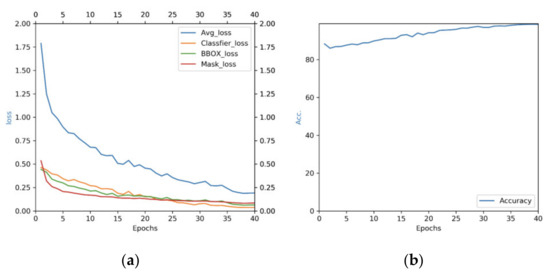 When we tested the parameters of RPN, we found that the current setting of 300 epochs tended to lead to overfitting and to cause low accuracy. Therefore, we decreased the epochs to 80, which gave us a direct mAP improvement of nearly 1%. We then tested the model with different strategies. When PANet and OHEM were applied independently, they both improved the results by approximately 2%. When they were both applied, the improvement reached 3–4%. Finally, we performed additional tests on model-9 with different numbers of epochs and chose 40 epochs as the final epoch value. The mAP of the bounding box was 0.365 and that of the segmentation was 0.373 in model-10. The curves of the training losses and accuracy in model-10 are shown in Figure 9. The training losses shown in Figure 9 include classifier loss (Classifier_loss), bounding box regression loss (BBOX_loss), mask branch loss (Mask_loss), and average loss (Avg_loss).