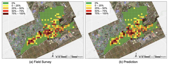 Since the prediction map in Figure 12 included the area used for the training set, we selected the grids containing only the test area, as shown in Figure 14. In a total of 37 grids reported by the field survey, there were 9 grids with the collapsed ratio of 0%, 7 grids with that of 0–25%, 9 grids with that of 25–50%, 9 grids with that of 50–75%, and 3 grids with that of 75–100%. For our prediction results, 9 grids were classified as the collapsed ratio of 0%, 7 grids as 0–25%, 12 grids as 25–50%, 7 grids as 50–75%, and 2 grids as 75–100%. The confusion matrix is shown in Table 8.
