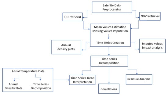 The satellite image processing and time series analysis were employed for the needs of the study. The R programming language was used for the time series analysis steps. Figure 2 presents the steps of the methodology.