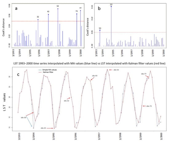 The Kalman filter created much fewer points of influence (Figure 3b) and produced smoother graphs (Figure 3c). In Figure 3b, point 22 that corresponds to December 1994 observation in Figure 3c, appears as a point of influence, with a Cook’s distance of about 0.16 that was much higher than the upper limit of the confidence level of 0.05 that is represented by the red line in the chart. We should note that observations 21 and 23 are missing values in the time series. Therefore, the influence of observation 22 on the Hat matrix was also exacerbated by the discontinuity and instability of neighboring values. Moreover, observation 10 corresponds to the LST value of December 1993 and it is a missing value in the original time series data. Here, the influence of observation 10, is also graphically evident in Figure 3c, where there is a noteworthy movement of point 10 after the application of the Kalman filter in relation to the MA interpolation.