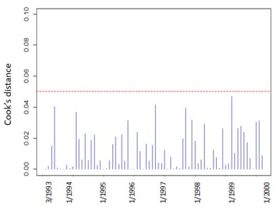 In Figure 3a, points 32, 43, 53, 73, and 77 that correspond to the LST observations for October 1995, September1996, July 1997, March 1999, and July 1999, respectively, appear as points of influence and they are significantly higher than the confidence level of 0.05. These points are also marked with arrows in Figure 3c and they do not appear to show a significant change in the graphical representation of the time series, so they do not appear to have any interest in contrast to points 10 and 22 which affect their neighboring points. Points 10 and 22 were removed from the original time series and were estimated using the Kalman filter. The Cook’s distance was derived from the updated time-series (Figure 4) and it showed no influential points.