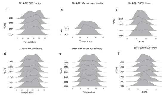 Density annual plots for: (a) LST time series 2014–2017; (b) aerial temperature time series 2014–2015; (c) NDVI time series 2014–2017; (d) LST time series 1994–1999, (e) aerial temperature time series 1994–1999, and (f) NDVI time series 1994–1999.