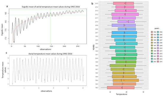 Diagrams about the aerial temperature 1992–2016 time series: (a) ergodic mean monthly values; (b) boxplot graph showing the mean (red dot) and median (black dash) values volatility, and (c) the monthly values.