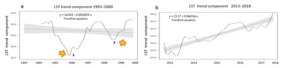 The LST trend component after decomposition: (a) Trendline (blue line) for the 1993–2000 time series with equation y = 24.818 − 0.0026929x. The arrows point to the areas of trend breakpoints; (b) Trendline (blue line) for the 2013–2018 time series with equation y = 23.17 + 0.046534x.