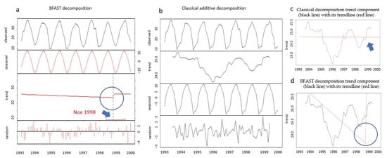 The BFAST algorithm application for the 1993–2000 time series: (a) decomposition with BFAST, one trend breakpoint showed in the blue circle over the trendline (red line); (b) classical decomposition; (c) trend component (black line) with its trendline (red line) and an arrow showing the break; and (d) the trend component (black line) overlying the trendline from the BFAST algorithm (red line) with the blue circle indicating the break.