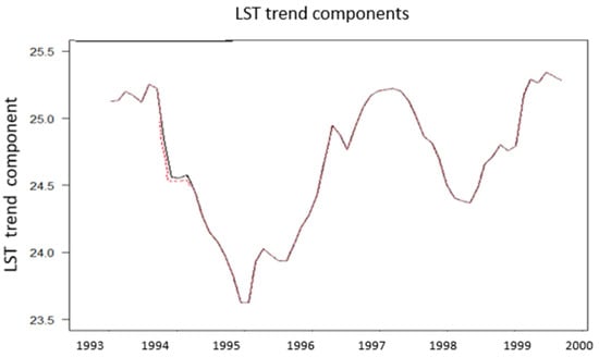 The additive decomposition model and the BFAST algorithm were also applied on the LST time series, in which the values of the influential points 10 and 22 were replaced by new values that were calculated by the Kalman filter (Figure 9). The results showed that influential points changed locally and very slightly the trend of the time series. The break points that were indicated by the BFAST algorithm were the same.