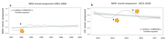 Decomposition of LST and NDVI time series was used to understand the response of NDVI to LST changes during the two time periods (1993–2000 and 2013–2018). LST and NDVI trends showed the magnitude of the change in time of the two variables and revealed smooth as well as abrupt changes. The relationships between the LST–NDVI trend lines indicated the systematic impact of LST changes on vegetation.