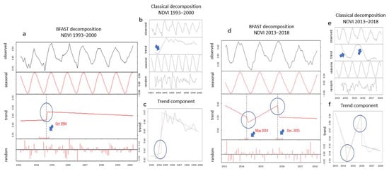 (a) The trend breakpoint for NDVI 1993–2000 time series is shown in the blue circle over the trendline, (b) decomposition of the NDVI 1993–2000 time series. The blue arrow points to the area of the breakpoint, (c) the NDVI 1993–2000 trend component (black line) overlaid over the trendline that was derived from the BFAST algorithm (red line). The blue circle indicates the break, (d) the two trend breakpoints for the NDVI 2013–2018 time series are shown in blue circles, (e) the decomposition of the NDVI 2013–2018 time series. The blue arrows point to the breakpoints, (f) the NDVI 2013–2018 trend component (red line) overlaid over the trendline that was derived from the BFAST algorithm (black line). The blue circle indicates the breaks.
