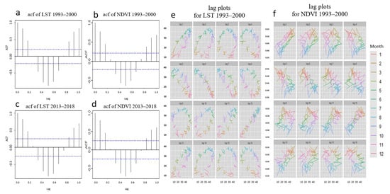 For the LST and NDVI 1993–2000 time series, autocorrelation function (ACF) (Figure 12a,b), shows a strong negative correlation on the sixth month. This result is also confirmed by the lag plots (Figure 12e,f), where the colors are indicative for the value of the variable on the y-axis. The relationship was very positive for the lag of 12 months (lag 12 in Figure 12e), reflecting the strong seasonality in the data while there was a strong negative relationship for the lag of six months (lag 6 in Figure 12e). It was observable that the negative correlation starts from lag 5 and lasts until lag 7. Regarding the 2013–2018 LST and NDVI time series, the results are very similar (Figure 12c,d).