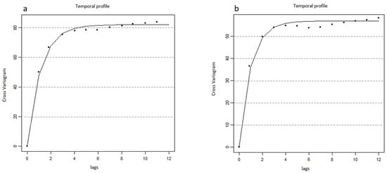 Cross-variogram for (a) the LST and the NDVI 1993–2000 time series; (b) the LST and the NDVI 2013–2018 time series.