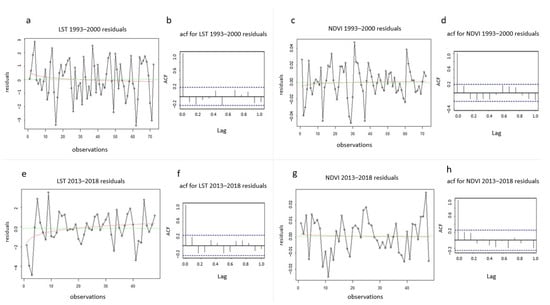 The residuals for the LST (Figure 15a,b,e,f) and NDVI (Figure 15c,d,g,h) time series did not present autocorrelation, therefore, the estimated quantities, such as the variations of the model coefficients but also the hypothesis tests were unbiased.