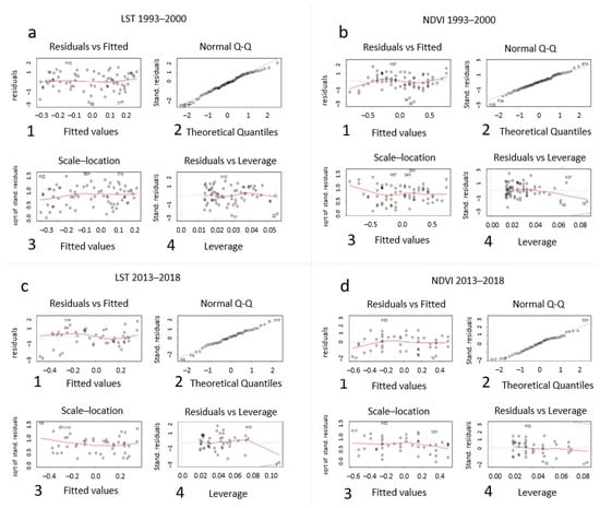 The time series for: (a) LST 1993–2000; (b) NDVI 1993–2000; (c) LST 2013–2018; (d) NDVI 2013–2018. For each time series plots include: (1) a residuals vs. fitted plot; (2) a normal Q-Q plot; (3) a scale-location plot, and (4) a residuals vs. leverage plot.