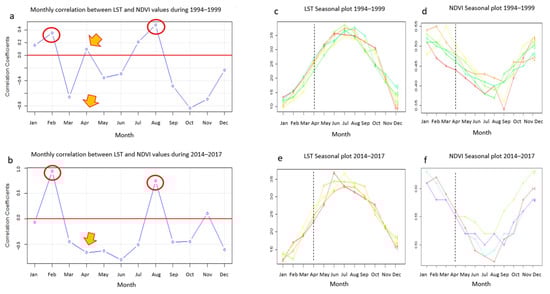 Cross-correlation coefficients plots between the LST and the NDVI residuals per month: (a) in the 1994–1999 time series; (b) in the 2014–2017 time series. Seasonal plots: (c) for the LST 1994–1999; (d) for the NDVI 1994–1999; (e) for the LST 2014–2017; and (f) for the NDVI 2014–2017. In (c–f) diagrams, there is a black dashed line indicating the month of April, which showed a peculiar behavior in the correlation. In these diagrams, the numbers 1,2,3,4,5,6 indicate the years 1994, 1995, 1996, 1997, 1998, 1999, for the 1994–1999 time series and the years 2014, 2015, 2016, 2017, for the 2014–2017 time series.