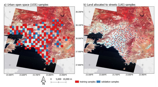 Τhe PlanetScope image mosaic in the background and training and validation samples for (a) urban open spaces (UOS) and (b) land allocated to streets (LAS). Basemap: Esri.