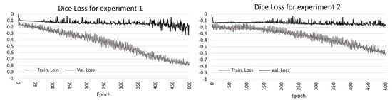 The training and validation Dice loss of the network for predicting the urban open spaces (UOS) in experiment 1 (only PlanetScope data) and experiment 2 (PlanetScope and Sentinel-1 data).