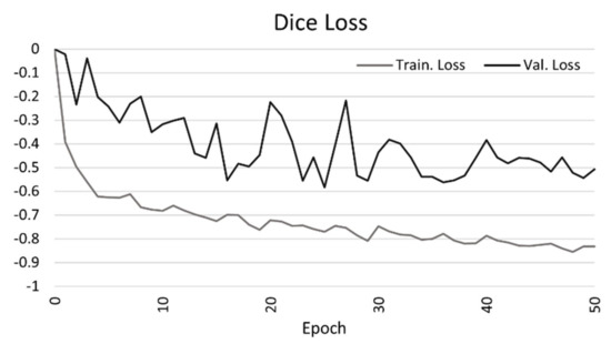 Two metrics were employed for evaluating the accuracy of the three networks: (a) the Keras binary accuracy and (b) the Intersection over Union (IoU). The binary accuracy reflects the frequency in which the predicted values match the reference values, with a threshold of 0.5, in a binary classification problem. The IoU [36] is calculated using Equation (5) and in analogy to the Dice coefficient, expresses the amount of overlap between the predicted and reference values, by penalizing errors more than the Dice coefficient.