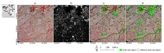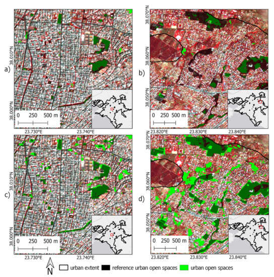 Regarding the UOS products, in general, the model of experiment 1 tended to underestimate the UOS, while the model of experiment 2 overestimated them. The resulting product of experiment 1, proved to be weaker in representing UOS, since omission errors were observed throughout the entire AMA, not only in small open areas (metropolitan and pocket parks) (Figure 7a), but also in greener suburbs of the city (Figure 7b). Conversely, in experiment 2, commission errors were found predominantly at the greener northern and eastern suburbs of the AMA (Figure 7d), where various non-public green spaces were mistakenly classified as UOS. In addition, commission errors of UOS were found around facilities which, although public, are not open and accessible to everyone (i.e., military camps, hospitals).