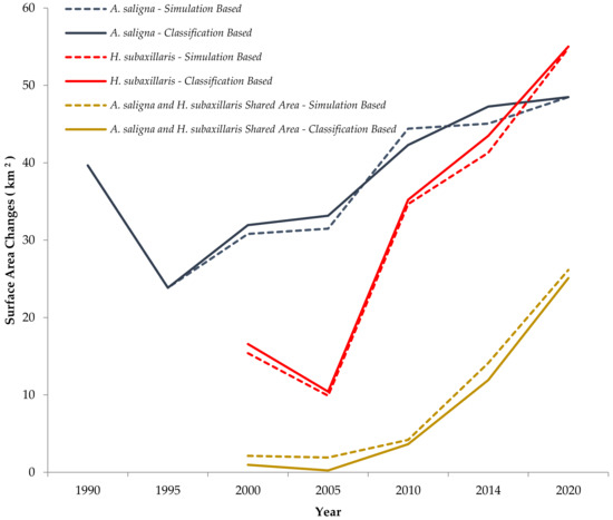 4.1. Land Cover Changes of A. saligna and H. subaxillaris and Their Expansion Rate from 2000 to 2020