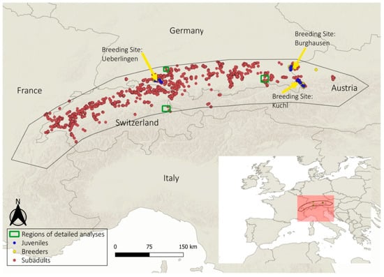 - Drenske, S.; Radchuk, V.; Scherer, C.; Esterer, C.; Kowarik, I.; Fritz, J.; Kramer-Schadt, S. Halfway to self-sustainability: Reintroduced migratory European Northern Bald Ibises (Geronticus eremita) still need management interventions for population viability. bioRxiv 2021. [Google Scholar] [CrossRef]