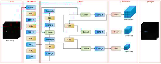 The architecture of YOLOv5 is manly composed of five parts: input, backbone, neck, prediction, and output. Figure 1 shows the architecture of YOLOv5. The CBL module is the basic module in YOLOv5, which is composed of a convolution (Conv) layer, batch normalization (BN) [] layer, and a Leaky_ReLu (L-ReLu) activation [] layer.