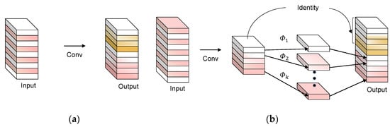 where yi′ is the i-th intermediate feature maps of Y′ and Φi,j is the j-th (j < s) linear operation to calculate the j-th final output feature maps yi,j from the i-th intermediate feature maps of Y′. The last Φi,s is an identity mapping operation as shown in Figure 4b. Since there are m intermediate feature maps and s linear operations, we can obtain n = m × s final output feature maps, where the number of output feature maps is equal to the original convolution operations.