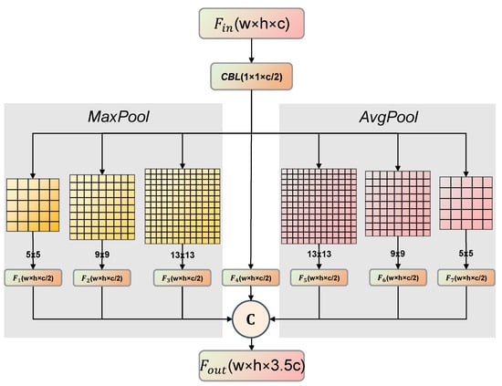 As shown in Figure 1, in the backbone part, by performing a Focus module, spatial information of the input image can be transferred into the channel dimension without losing details. The raw backbone part of YOLOv5 is CSPDarknet53, and it is used for feature extraction through a cross stage partial (CSP) module [], which consists of a bottleneck structure and three convolutions. There are two kinds of CSP modules. The CSP in the backbone, respectively, consists of one residual unit (i.e., CSP1_1) or three residual units (i.e., CSP1_3), while the CSP in the neck (i.e., CSP2_1) replaces the residual units with the CBL modules. Moreover, the spatial pyramid pooling (SPP) [] module offers different receptive fields to enrich the expression ability of features.