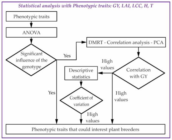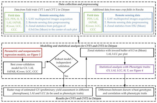 The modelling process is summarised in Figure 2. The field and remote sensing data are the input for constructing the parametric and nonparametric models. The best model for GY retrieval is applied to present a map of GY with very high spatial resolution. The best models for biophysical variable retrieval serve as high-throughput remotely sensed phenotypic traits. The selected remotely sensed and traditional traits are analysed for detection of genetic diversity, proximity, and similarity in the studied genotypes.