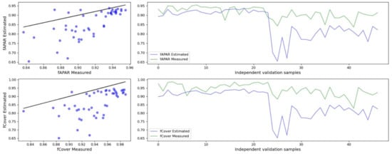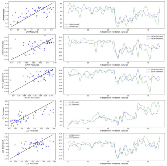 Biophysical variables and crop yield are traits of great interest to breeders since they are directly related to crop productivity. They are often used as crop phenotypic traits under field conditions [6]. Leaf area index, fraction of absorbed photosynthetically active radiation (fAPAR), and fractional vegetation cover (fCover) have been recognised as essential variables by the Group on Earth Observations Global Agricultural Monitoring Initiative (GEOGLAM) for the study of agriculture [33]. Chlorophyll, measured as leaf chlorophyll content (LCC) and canopy chlorophyll content (CCC), is an important photosynthetic pigment to the plant, largely determining photosynthetic capacity and hence plant growth.