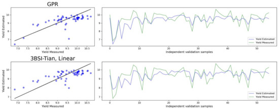 Instead of directly using the spectral bands to train nonparametric regression models, an interesting approach is using VIs as input for nonparametric regression [30,31,32]. In this case, the features are either retrieved by applying VIs and then the output of the best performing parametric models is fed as an input to the nonparametric models, or just by choosing one index, for example, NDVI. This method is applied to retrieving soybean yield from UAV multispectral sensors, RGB, multispectral and thermal [30], UAV hyperspectral sensor [32], and wheat yield from satellite NDVI [31] with high accuracy.