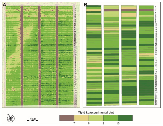 Yield is a major quantitative trait formed in a complex manner by all other traits related to productivity. It is a leading feature in breeding programs and its improvement is a major task that requires high-throughput phenotyping platforms. From the point of view of plant breeding, yield per unit area is of considerable importance [1,2] and the primary goal is to expand genetic diversity and develop new cultivars that perform better than those grown in the target population of environments. Traditionally, breeders search for genetic variation among winter durum wheat (Triticum turgidum L. var. durum) parents to derive superior progeny from crossing and selection [1]. To meet this goal, high-throughput field-phenotyping tools are needed [3]. Field phenotyping in plant breeding measures small plots with limited resources available and time required for the measurements, considering the quality of the acquired data and data analysis. Even if field-based high-throughput phenotyping platforms remain a barrier for future breeding advances [4,5,6], the existing relatively low-cost sensors and unmanned aerial vehicles (UAVs) provide possibilities for producing extensive amounts of georeferenced data. Whilst challenging to manage, such large datasets also offer opportunities for applying new modelling techniques, such as machine learning [7] and increasing selection intensity, improving selection accuracy, and improving the decision support system.